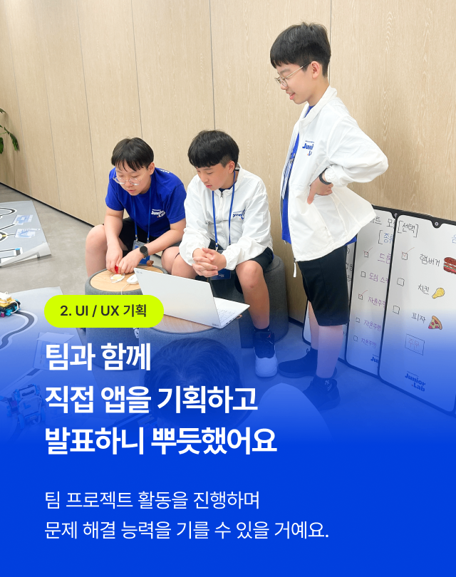 코딩 경험이 없더라도, 중학생 아이라면 쉽게 배울 수 있는 수준에서 교육하고 있어요. 수업 내내 잘 따라올 수 있도록 코딩 전문 교육 선생님이 꼼꼼하게 챙겨주시니 걱정 말고 지원해주세요.