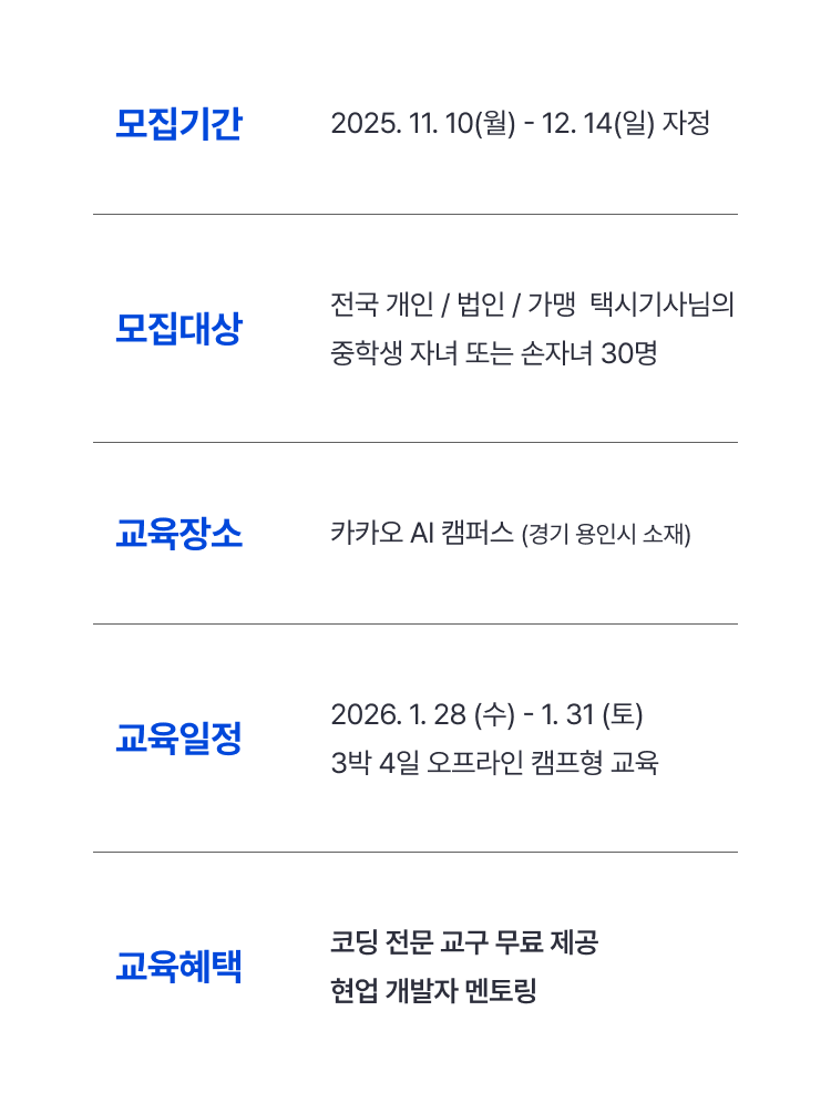 캠프는 카카오 및 계열사 임직원을 위해 운영하는 '카카오 AI 캠퍼스'에서 숙박형으로 진행됩니다. 모든 아이들에게 1인 1실의 객실이 배정되면 24시간 내내 지도 선생님이 상주하여 아이들을 보살필 예정이에요.